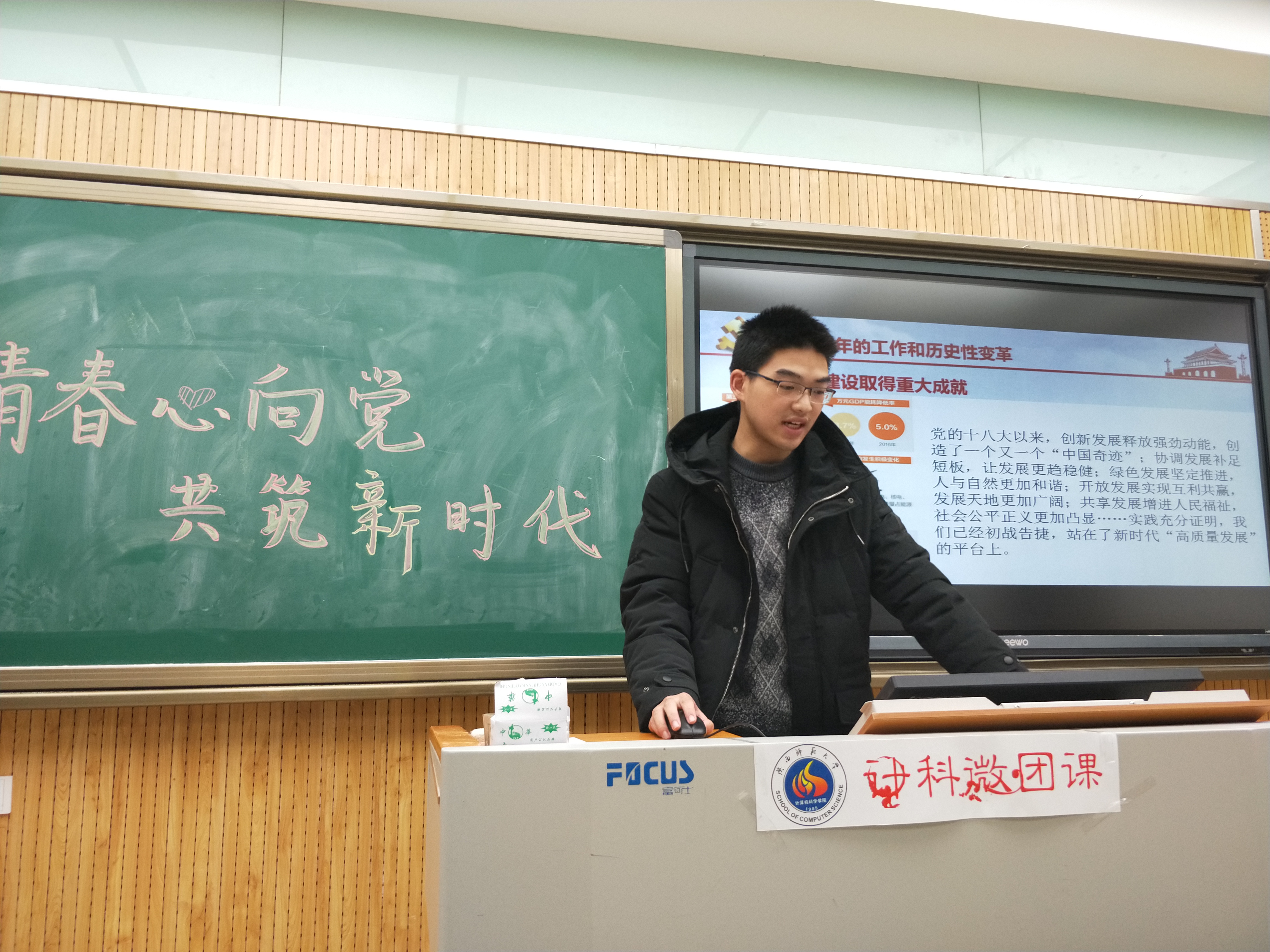 为了深入学习并贯彻党的十九大精神,落实习近平总书记提出的青年工作思想和党的群团工作会议精神,增强团员先进性和光荣感,20171214日下午,2017级计类一班在8104举行了以青春心向党,筑梦新时代”为主题的团日活动。