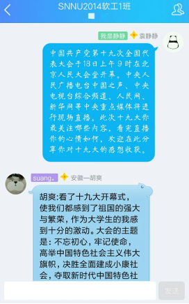 首先,大家就《习近平的七年知青岁月》系列内容发表了心得感悟,深入理解并践行着榜样精神。随后同学们关于#青春喜迎十九大 不忘初心跟党走#这一话题展开了热烈讨论。