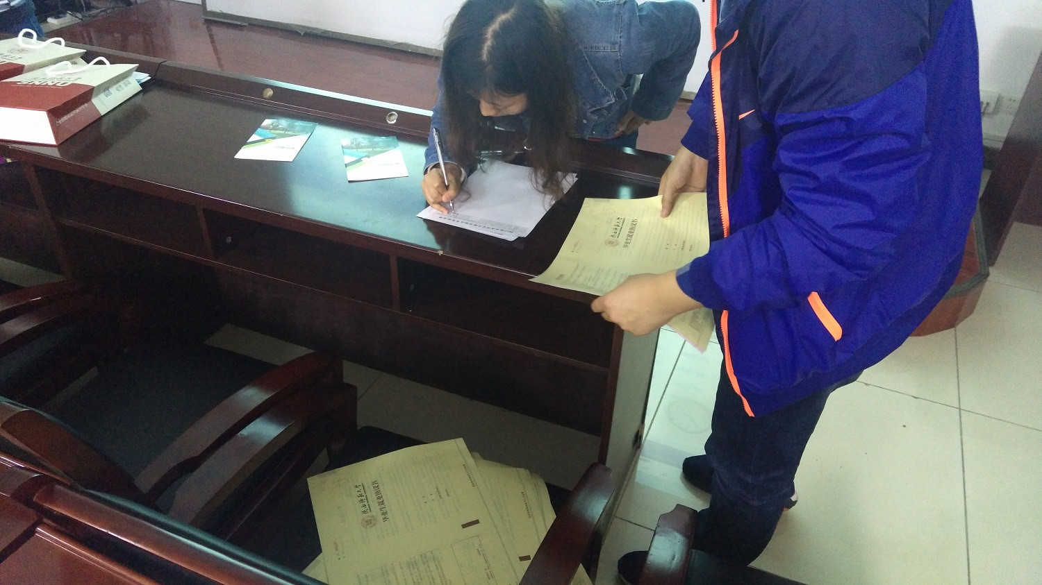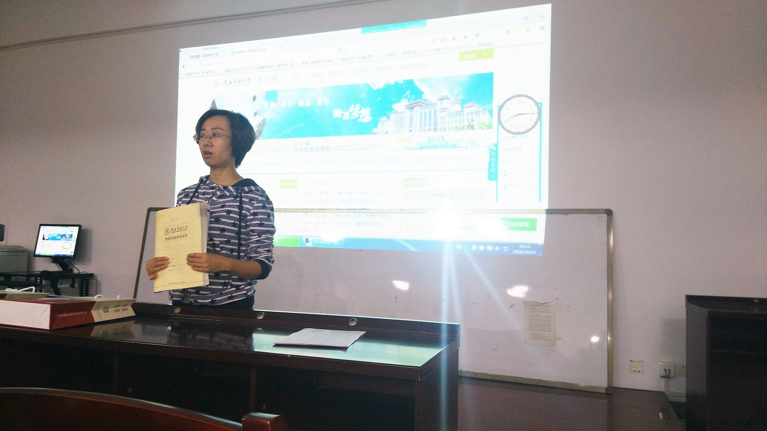 会议开始之前,胡雯洁向毕业生发放了就业协议书、就业推荐表、就业指南等材料。会上,胡老师详细讲解了学校就业制度,对就业协议书的填写作了详细说明,并对如何进行网上填报就业信息进行了现场演示。随后,胡雯洁向大家介绍了学院2017届毕业硕士研究生的就业情况和学院针对研究生所开展的就业指导服务工作,分析了学院硕士研究生应聘求职过程中存在的问题,她鼓励同学们找准立足点,准确定位、拓宽视野,以积极的心态面对求职中遇到的困难与问题,争取早日签约,找到心仪的工作。